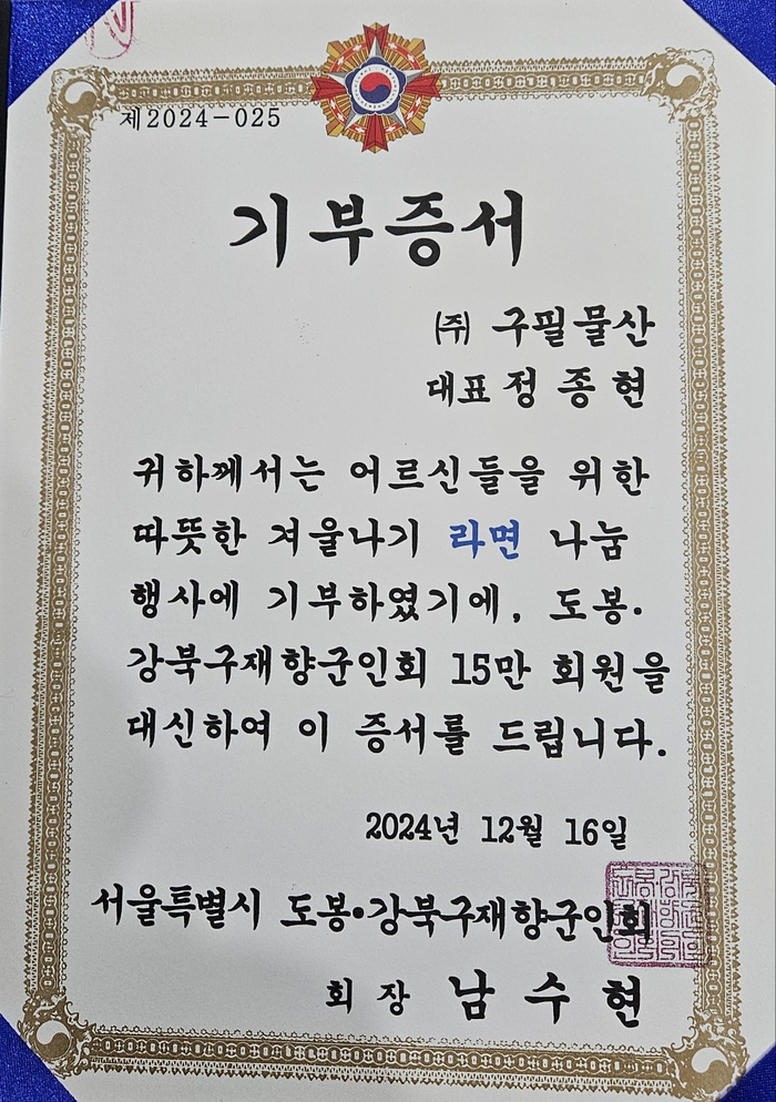 남수현 도봉·강북 재향군인회 회장은 “구필물산의 따뜻한 나눔에 깊이 감사드리며, 이러한 선행이 큰 힘이 된다”고 감사의 인사를 전했다.