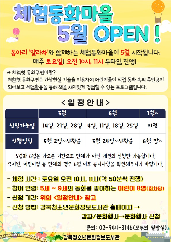 오는 6월까지는 매주 토요일 개인 신청만 가능하고, 7월부터 유치원, 어린이집 등 단체 신청을 받을 예정이다. 동화마을과 관련된 기타 자세한 사항은 강북청소년문화정보도서관으로 문의하면 된다.