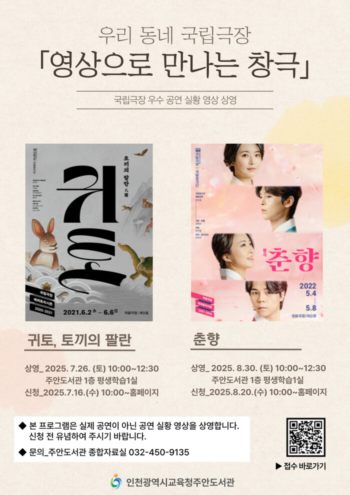 [인천=문찬식 기자] 인천광역시교육청주안도서관(관장 최문정)은 국립극장의 우수 창극 공연 실황을 영상으로 감상하는 ‘우리 동네 국립극장 – 영상으로 만나는 창극’ 프로그램을 운영한다.