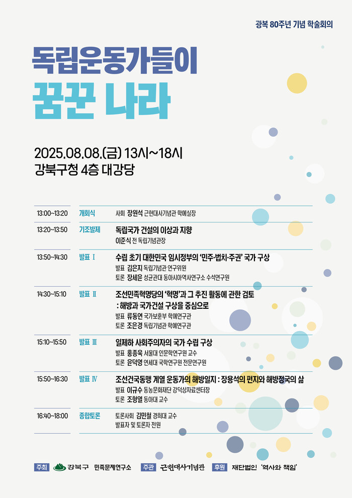 [시민일보 = 문민호 기자] 강북구(구청장 이순희)는 광복 80주년을 맞아 근현대사기념관을 중심으로 특별전시, 학술회의, 체험행사 등 다채로운 프로그램을 운영하며 지역에 깃든 독립운동의 의미를 되새기고 있다고 4일 밝혔다.