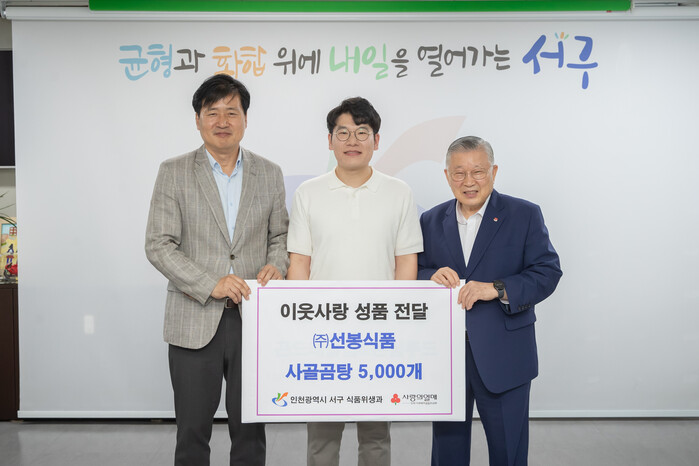 [인천=문찬식 기자] 인천 서구(구청장 강범석)는 오류동 소재 식품제조가공업 (주)선봉식품(대표 고종국)이 관내 어려운 이웃들에게 1,000만원 상당의 사골곰탕 5,000개 식품을 사랑의 빨간밥차(이사장 이선구 목사)에 기부하고 전달식을 가졌다고 14일 밝혔다.