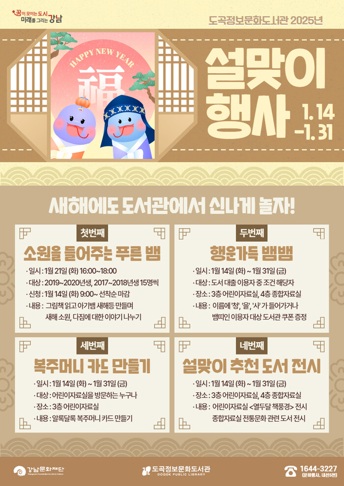 [시민일보 = 이대우 기자] (재)강남문화재단(이사장 이자연)에서 운영하는 도곡정보문화도서관에서 <2025 설맞이 행사>를 개최한다.