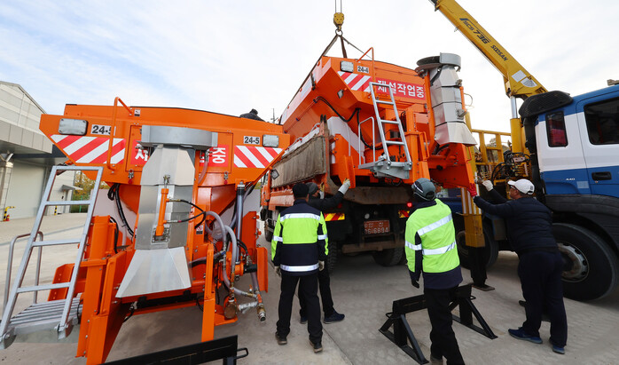 본격적인 겨울철 앞두고 19일 인천 서구 원창동 제설 장비 자재창고에서 인천종합건설본부 관계자들이 덤프트럭에 제설제 살포기를 설치하고 있다. 이날 인천종합건설본부는 제설대책 기간(11월15일~3월15일)에 운영할 38대의 제설 차량을 마련했다.