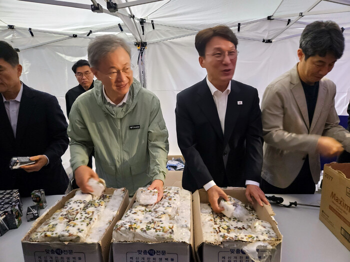 장인홍 구로구청장이 최근 남구로역 새벽인력시장을 방문했다. 사진은 장 구청장(왼쪽 두 번째)이 근로자들에게 격려물품을 나눠주는 모습. (사진=구로구청 제공)