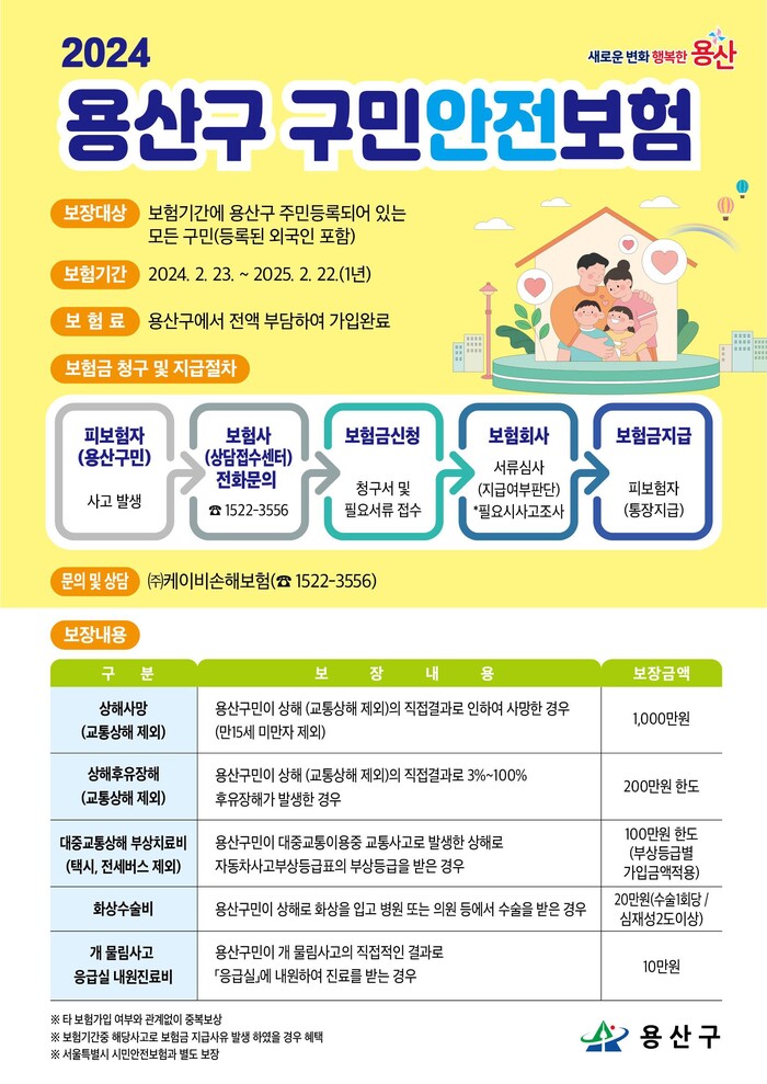 [시민일보 = 여영준 기자] 용산구(구청장 박희영)는 오는 2025년 2월22일까지 등록외국인을 포함한 모든 구민에게 구민안전보험을 지원한다고 밝혔다.