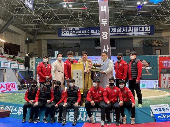 | ▲ 영암군민속씨름단 소속 백두급 윤성민 장사가 지난 28일 거재장사 씨름 대회에서 백두 장사 타이틀을 획득 한 후 소속 감독 및 각급 장사등과 기념촬영을 하고 있다. / 사진=영암군 제공 |