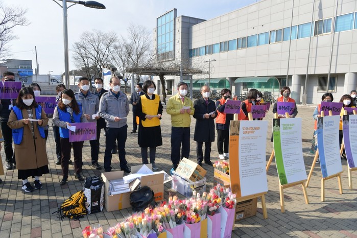 충남 예산군은 8일 세계여성의 날을 기념하기 위해 예산성폭력상담소, 여성단체협의회와 함께 '해피 우먼스 데이' 캠페인을 개최했다. 이날 캠페인은 예산성폭력상담소의 주관으로 추진됐고, 등신대를 제작해 장미꽃 400송이를 나누며 진행됐다. 사진은 이날 황선봉 군수가 관계자들과 함께 캠페인을 진행하고 있는 모습. (사진제공=예산군청)