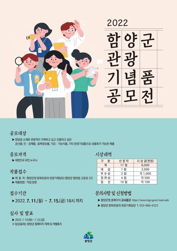 군 관계자는 “이번 공모전으로 아이디어 넘치는 우수 관광기념품을 발굴해 함양 브랜드 향상 및 관광 경쟁력을 강화하고자 한다. 함양 고유의 특성을 담아 많은 분들이 신청하시길 바란다”고 전했다.