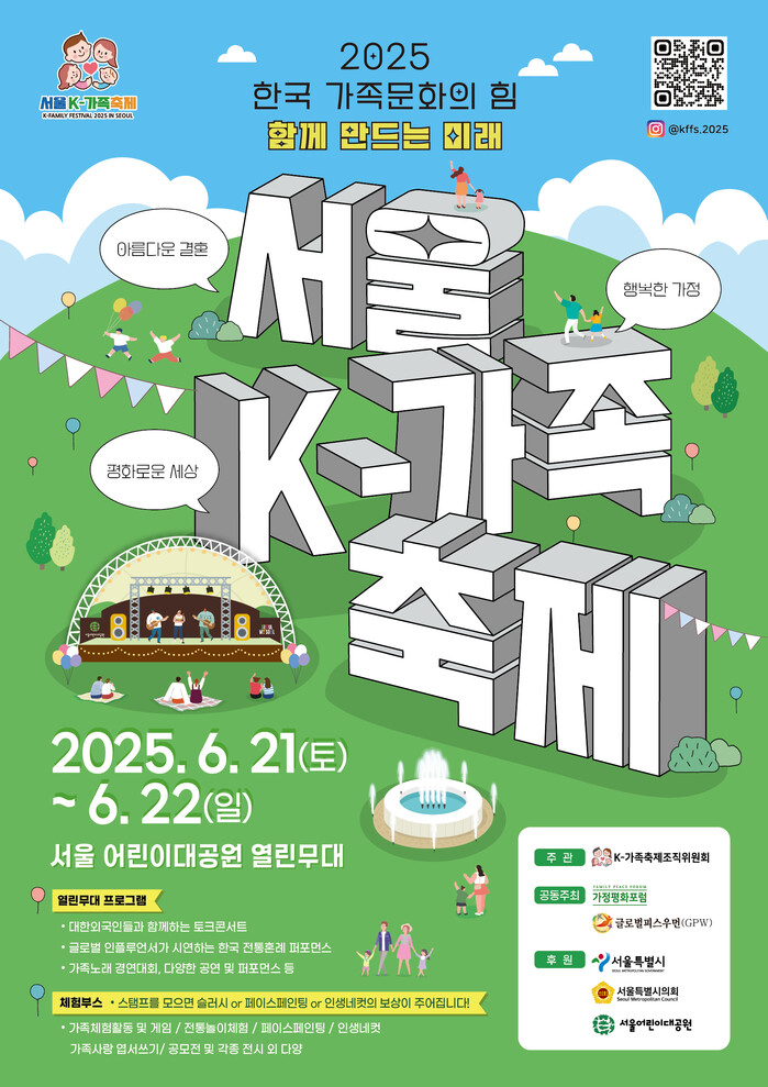[시민일보 = 여영준 기자] 2025 K-가족축제조직위원회(이하 K-가족축제조직위)가 주관하고, 가정평화포럼과 글로벌피스우먼(GPW)이 공동 주최하며, 서울특별시와 서울특별시의회, 서울어린이대공원이 후원하는 ‘2025서울K-가족축제’가 오는 21~22일 서울어린이대공원 열린무대 일대에서 열린다.