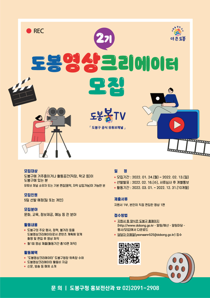 [시민일보 = 여영준 기자] 서울 도봉구(구청장 이동진)는 지역주민이 직접 구의 공식 유튜버가 돼 활동하는 ‘도봉영상크리에이터(이하 도영크) 2기’를 모집한다고 24일 밝혔다.