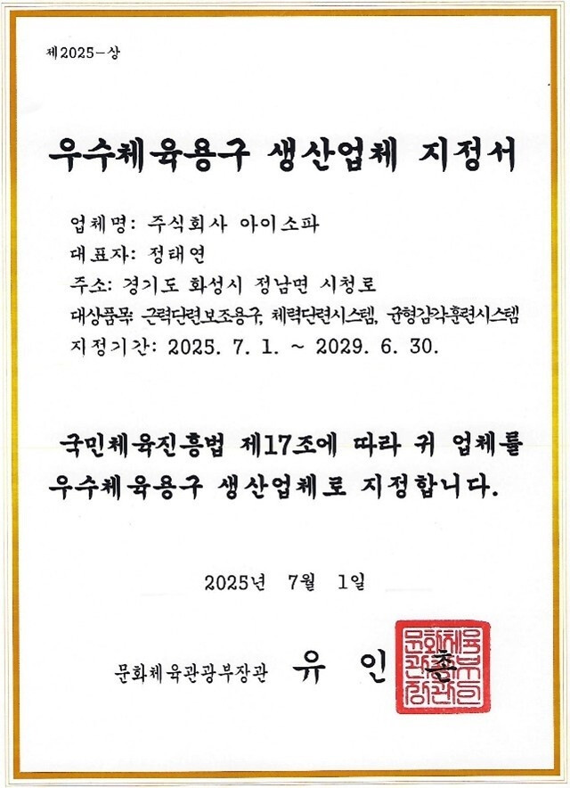 아이소파는 그간 ISO 9001 / ISO 14001 품질·환경경영시스템 인증, 이노비즈·메인비즈 인증, 벤처기업 인증 등을 통해 기업 신뢰성과 기술력을 공고히 해왔다. 이번 ‘우수체육용구 생산업체’ 재지정은 그간의 연구개발 노력과 품질 혁신에 대한 정부 차원의 공식 인정으로 해석된다.
