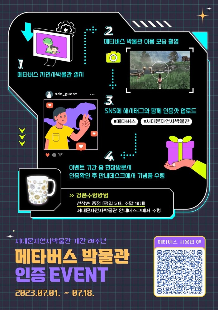 이벤트 참여 희망자는 메타버스 서대문자연사박물관 서비스를 이용한 뒤, 촬영한 메타버스 화면과 해시태그(#메타버스, #서대문자연사박물관)를 자신의 개인 소셜네트워크서비스(SNS)에 올리면 된다.