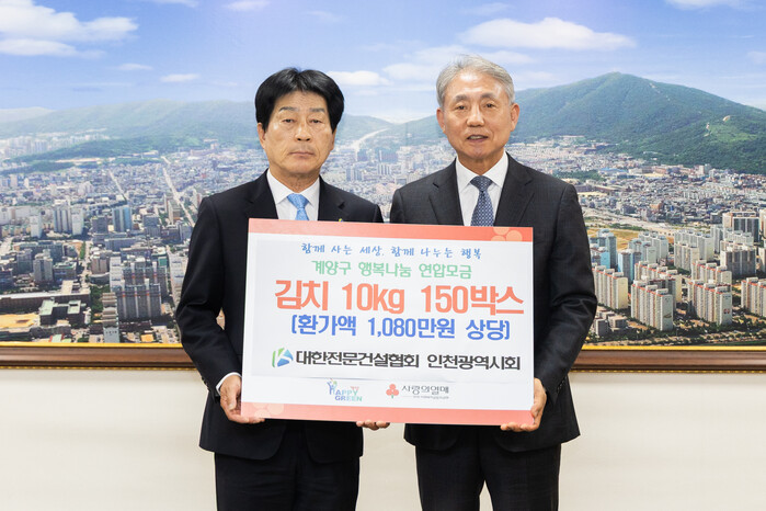 [인천=문찬식 기자] 인천 계양구(구청장 윤환)는 지난 24일 대한전문건설협회 인천광역시회(회장 조흥수)가 취약계층의 겨울철 식생활 지원을 위해 김치(10kg) 150박스(환가액 1,080만 원 상당)를 기탁했다고 밝혔다.