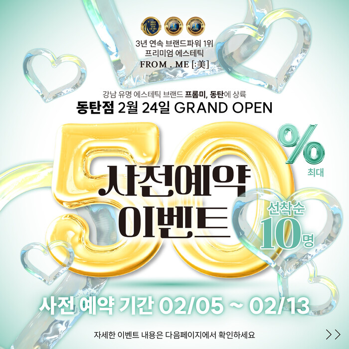 프롬미는 이번 02월 24일 오픈하는 동탄점 포함하여 총 10개의 지점을 보유하고 있으며, 토탈뷰티 프랜차이즈 전문 브랜드로써 평균 10년 이상 경력의 전문진과 프라이빗하고 위생적인 1-2인실, 일회용 해면 및 비품 사용, 자체 개발 비건 제품 사용으로 고객님들에게 최고의 서비스 제공 및 최고의 만족도를 선물하며 많은 사랑을 받고 있는 브랜드이다.