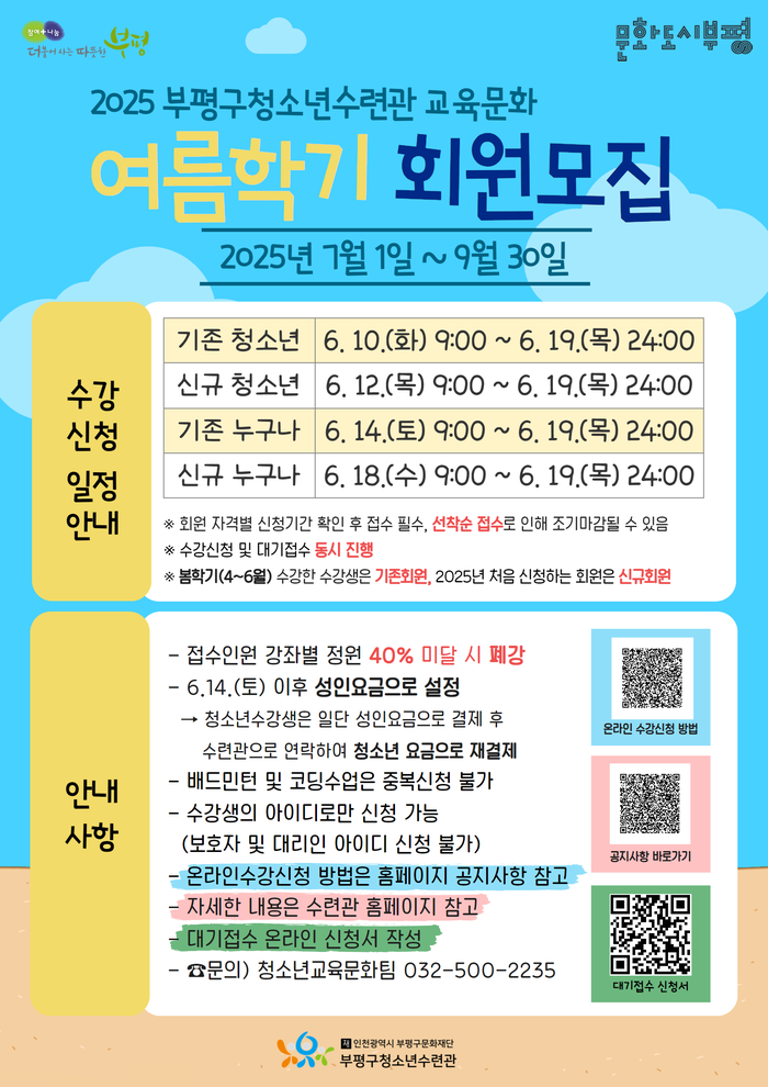 [인천=문찬식 기자]인천 부평구 청소년수련관은 지역 청소년과 주민을 위한 교육문화 여름학기(7~9월) 강좌 회원을 모집한다고 4일 밝혔다.