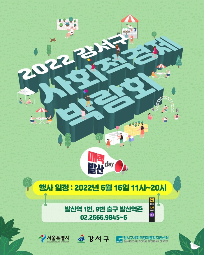 [시민일보 = 홍덕표 기자]강서구(구청장 노현송)가 16일 마곡문화의 거리 발산역존(발산역 1·9번 출구 앞)에서 '2022 사회적경제 박람회'를 개최한다.