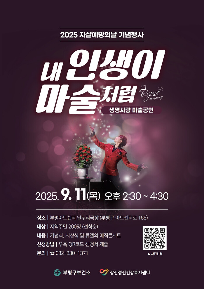[인천=문찬식 기자] 인천 부평구(구청장 차준택) 삼산정신건강복지센터는 ‘세계 자살예방의 날’을 맞아 오는 11일 오후 2시 30분 부평아트센터 달누리극장에서 생명사랑 마술공연 ‘내 인생이 마술처럼’을 진행한다.