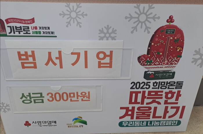 [시민일보 = 이대우 기자] 은평구(구청장 김미경) 불광1동은 최근 범서기업으로부터 ‘따뜻한 겨울나기’ 캠페인 성금 3백만 원을 기부받았다고 밝혔다.