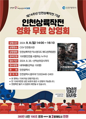 [인천=김형만 기자] 인천시는 제74주년 인천상륙작전 기념주간을 맞아 오는 9월 8일 오후 2시, CGV 인천점(6관)에서 ‘인천상륙작전:익스텐디드 에디션(확장판)’영화를 무료로 상영한다고 22일 밝혔다.
