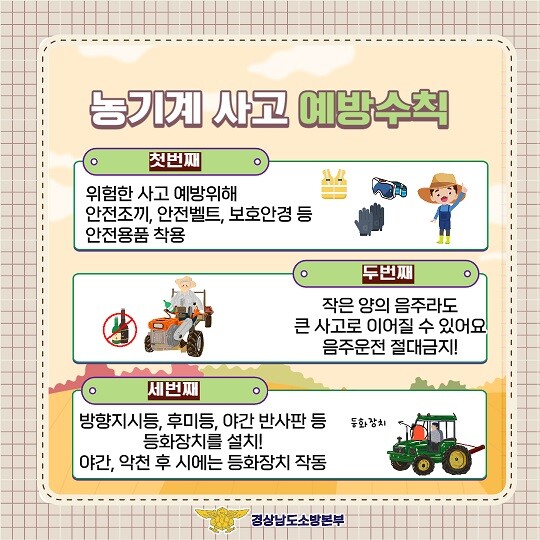 농기계 안전사고 예방수칙은 ▲농기계 사용 전후 철저한 장비 점검 ▲농로, 비탈길 등 주행 시 서행 ▲야간 운행 대비 등화장치ㆍ반사판 부착 ▲음주운전 절대 금지 ▲도로 주행 시 교통법규 준수 등이다.