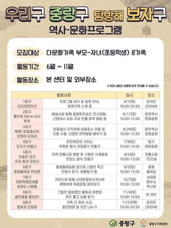 [시민일보 = 여영준 기자] 중랑구(구청장 류경기)는 6~11월 중랑구가족센터에서 다문화가족을 대상으로 '우리구 중랑구 탐방해 보자구' 역사·문화프로그램을 운영한다고 밝혔다.