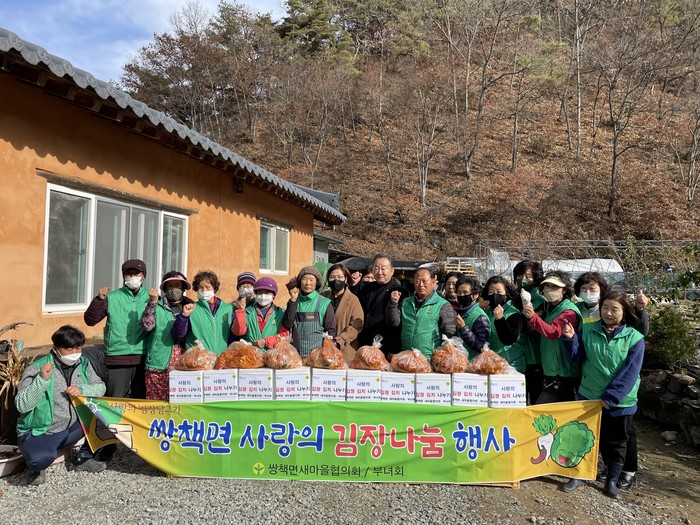 이번 행사는 새마을협의회·부녀회원 30여 명이 참석하여 배추 150포기를 3일동안 재료 손질부터 시작해서 양념에 직접 버무려 김치를 담갔고, 박은숙 쌍책면장과 박진식 새마을운동합천군지회장 및 노태윤 동부농협 조합장을 비롯한 관내 사회기관단체장이 방문하여 추운 날씨에 고생하는 회원들을 격려하고 감사의 마음을 전했다.