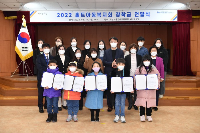 경기 하남시종합사회복지관은 최근 지역내 저소득가정 아동·청소년의 학습격차 해소를 위해 장학금 전달식을 개최했다. 신규 장학생 5명과 하남시지역아동센터 10곳의 장학생에게 1억원의 장학금을 전달했다. 사진은 전달식에서 김상호 시장(둘째 줄 오른쪽 세 번째)과 장학생 및 관계자들이 기념촬영을 하고 있는 모습. (사진제공=하남시청)
