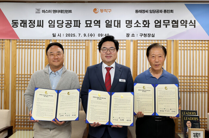 이날 협약식에는 박일하 구청장을 비롯해 정진원 동래정씨 임당공파 종친회장과 김종철 마스터엔터테인먼트 대표이사가 참석했으며, 서울시 지정 국가유산인 해당 묘역 일대를 지역의 대표적인 명소로 조성하는 데 상호 협력하기로 뜻을 모았다.
