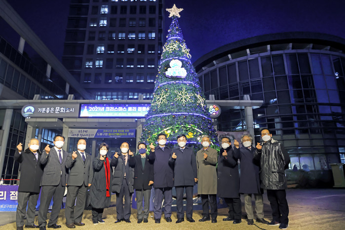 서울 도봉구가 구청사 전면 광장에 크리스마스 트리를 설치하고 최근 점등식을 실시했다. 사진은 이동진 구청장(오른쪽에서 다섯 번째)이 관계자들과 기념촬영을 하고 있는 모습. (사진제공=도봉구청)