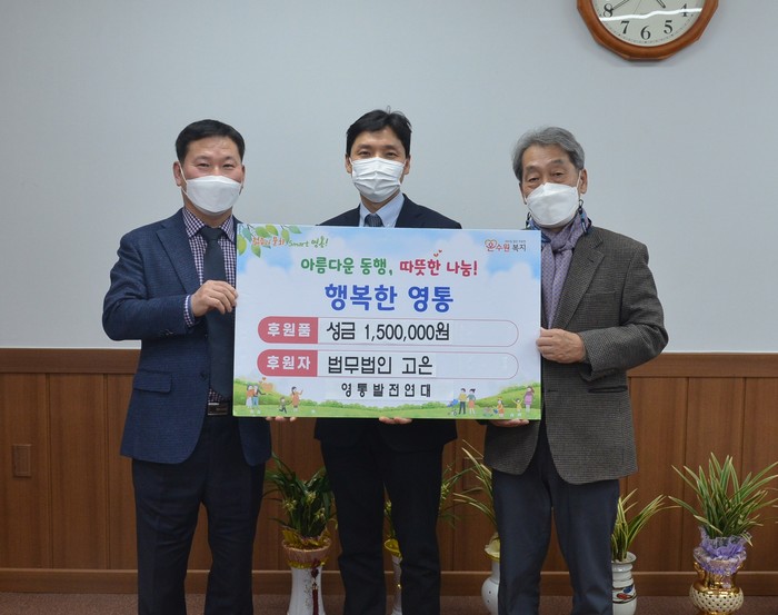 경기 수원시 영통구는 18일 법무법인 고운으로부터 설맞이 지역내 저소득 홀몸노인을 위한 성금 150만원을 기탁받았다. 이날 기부받은 성금은 코로나19 및 추운 날씨로 어려움을 겪고 있는 지역내 저소득 홀몸노인 가구에 전달될 예정이다. 사진은 전달식에서 김선재 구청장(왼쪽)과 관계자들이 기념촬영을 하는 모습. (사진제공=영통구청)