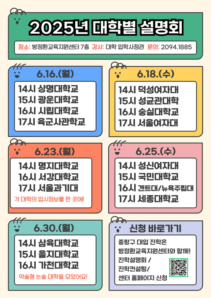 아울러 오는 7월5일에는 중랑구청 지하 대강당에서 ‘생각하는 대(大)로 수시지원 전략 설명회’가 열린다. 설명회에서는 중랑구 출신 대학 합격생의 진학 사례 발표 및 입시 전문가의 실전 전략 강연이 함께 진행된다.