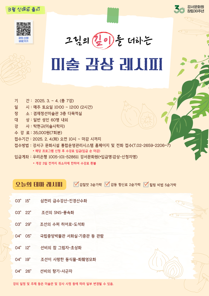 먼저 겸재정선미술관에서 운영하는 ‘미술감상 레시피’는 주말에 성인 60명을 대상으로 하는 인문 강좌다. 조선시대 그림을 주제로 진경산수화, 풍속화 및 사군자에 대한 흥미로운 해설로 구성되어 있다.
