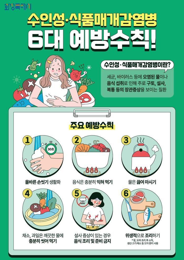 [화성=송윤근 기자] 경기 화성특례시(시장 정명근)가 최근 고온다습한 기후가 계속됨에 따라 수인성·식품매개감염병 예방을 위한 6대 수칙을 준수해 줄 것을 당부했다.