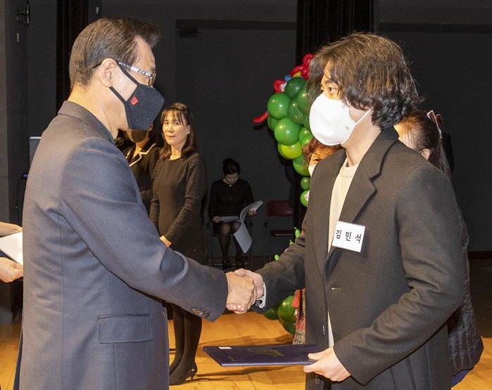 서울 용산구는 최근 ‘2021년 자원봉사자의 날 기념식’을 개최하고, 구청장 표창(21명) 등 총 29명에게 우수 자원봉사 유공자 시상을 했다. 사진은 이날 시상식에서 성장현 구청장(왼쪽)이 표창장을 전달하고 있는 모습. (사진제공=용산구청)