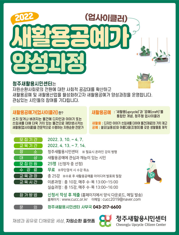교육기간은 4. 13. ~ 7. 14.까지 청주새활용시민센터에서 오프라인 강의로 진행되며(코로나19 상황에 따라 필요 시 온라인 강의 병행 가능) 참여자는 새활용공예에 관심과 재능이 있는 25명을 신청자 중 선정할 계획이다.
