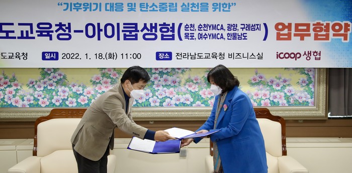 전라남도교육청과 전남지역 7개 아이쿱(iCOOP) 생활협동조합이 지난 18일 기후위기 대응 및 탄소중립 실천을 위한 업무협약을 체결했다. 주요 내용은 기후위기 대응교육 및 탄소중립 실천을 위한 협력관계 구축 등이다. 사진은 협약식에서 장석웅 교육감(왼쪽)과 관계자가 협약서를 교환하고 있는 모습. (사진제공=전라남도교육청)