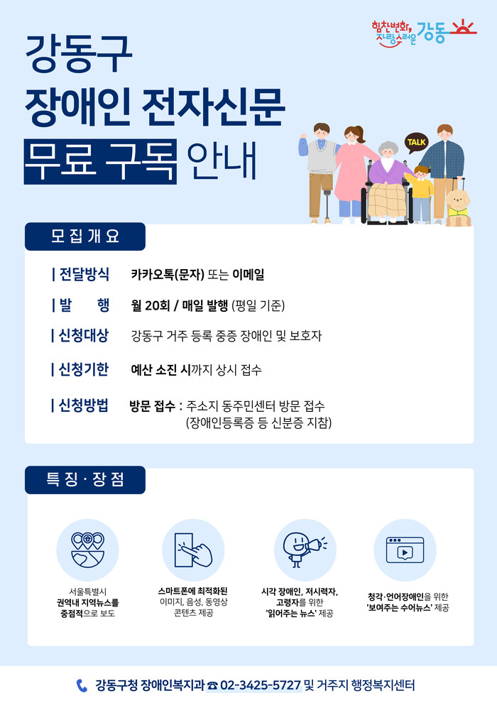 [시민일보 = 이대우 기자] 강동구(구청장 이수희)는 장애인의 정보 접근성을 높이기 위해 올해 처음으로 추진하는 ‘2025년 장애인 전자신문 보급 사업’의 구독자를 모집한다고 31일 밝혔다.