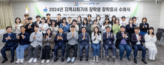 | ▲ 진교훈 서울 강서구청장(앞줄 오른쪽 여섯 번째)이 지난 29일 구청 대회의실에서 열린 ‘2024년 지역사회기여 장학생 장학증서 수여식’에서 학생들과 박수를 치며 기념촬영을 하고 있다.(사진=강서구청 제공) |