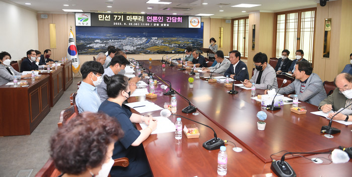 구인모 거창군수는 22일 군청 상황실에서 민선 7기를 마무리하는 언론인 간담회를 열고 지난 4년간의 군정 주요성과와 반성, 주요현안 사항 등을 공유하고 참석 언론인들과 소통하는 시간을 가졌다.