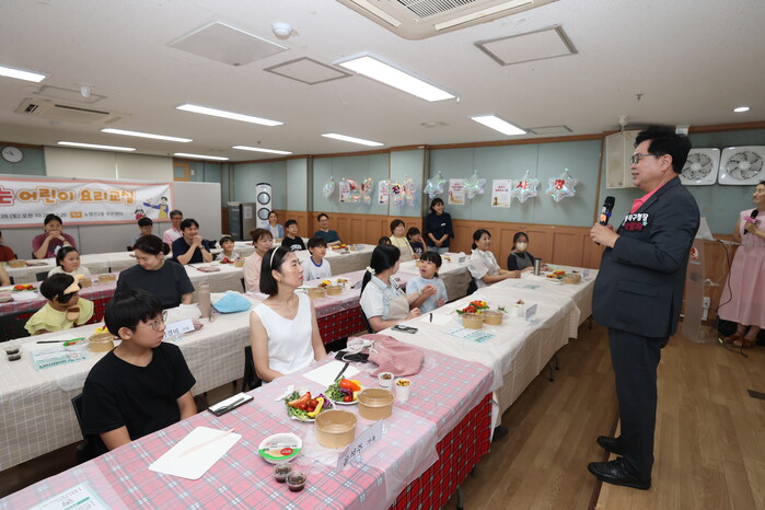 동작구가 지난 26일 노량진2동 주민센터에서 공유부엌 활성화 어린이 요리교실을 진행했다. 사진은 박일하 구청장이 공유부엌 어린이 요리교실에 참석해 인사말을 하고 있는 모습. (사진=동작구청 제공)