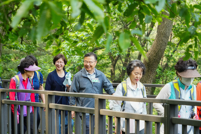 | ▲ 걷기클럽에 참여 중인 류경기 중랑구청장. (사진=중랑구청 제공) |