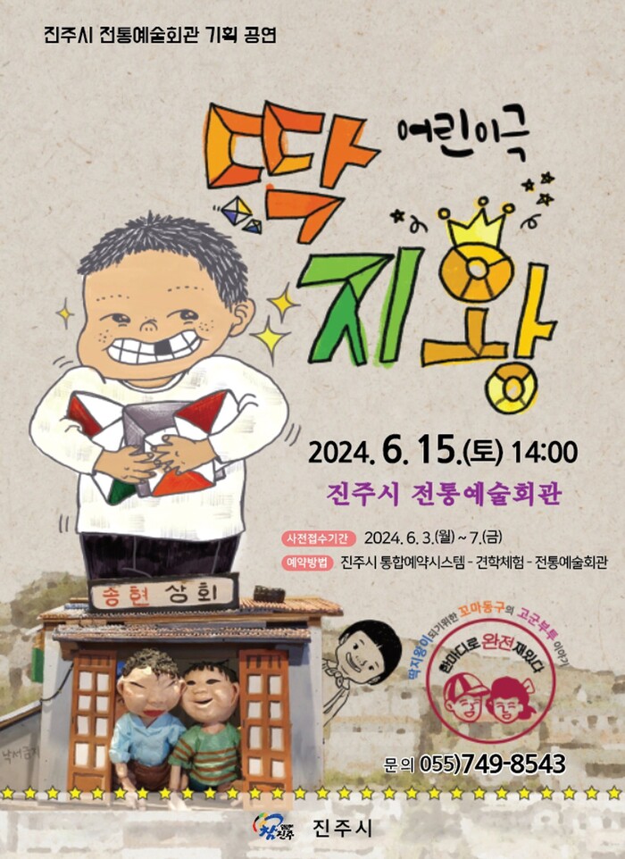 진주시는 오는 6월 15일 오후 2시 진주시 전통예술회관에서 올해 첫 기획 공연으로 어린이 연극 『딱지왕』을 선보인다.