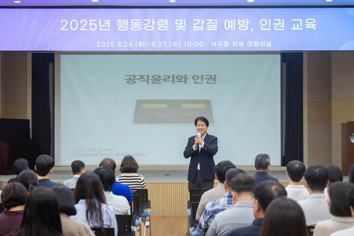 [인천=문찬식 기자] 인천 서구(구청장 강범석)는 지난 26일부터 이틀간 구청장을 비롯한 전 부서 공직자 500여 명을 대상으로 ‘행동강령 및 갑질 예방, 인권 교육’을 실시했다고 27일 밝혔다.