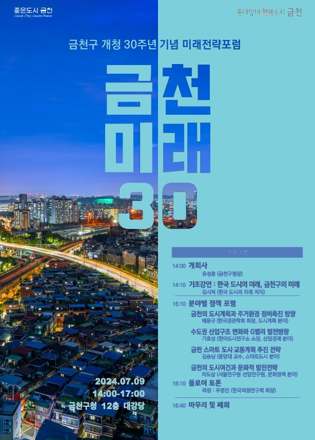 [시민일보 = 여영준 기자] 금천구(구청장 유성훈)는 오는 9일 오후 2시 구청 대강당에서 개청 30주년을 준비하기 위한 ‘미래전략 포럼’을 개최한다고 4일 밝혔다.