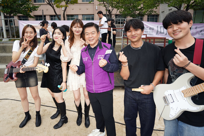 | ▲ 동대문구 청년주간행사 ‘동청제’에 참석한 이필형 구청장이 동대문구 지역내 대학 밴드동아리와 사진을 찍고 있다. (사진=동대문구청 제공) |