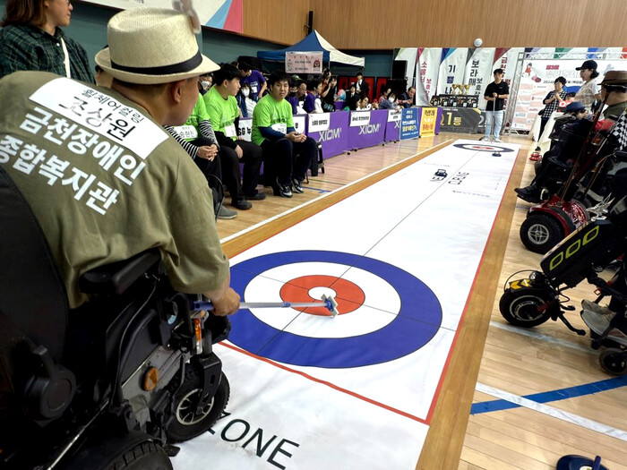 금천구는 최근 금나래 문화체육센터에서 ‘우리동네 컬링대회’를 성황리에 개최했다. 행사는 금천장애인복지관이 주관해, 장애인복지 업무를 수행하는 16개 기관에서 100여명의 선수단과 700여명의 장애인과 가족들이 참여했다. 사진은 우리동네 컬링대회 참여자가 경기를 진행하고 있는 모습. (사진=금천구청 제공)