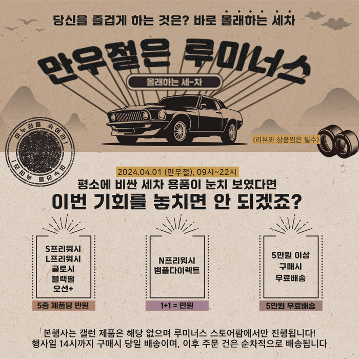 국내 자동차 디테일링 전문기업 루미너스(주식회사 엘엠)가 만우절을 맞아 만우절이벤트는 진행한다. 이번 이벤트는 루미너스에서 판매가 잘되는 제품들과 신제품을 선정하여 제품당 만원에 구입할 수 있는 이벤트다