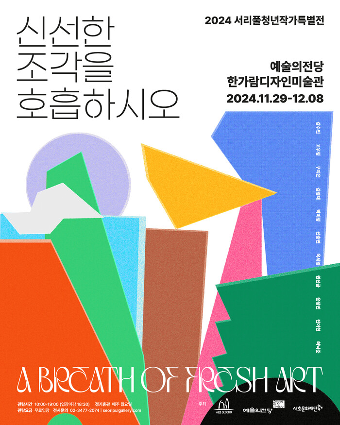 [시민일보 = 박소진 기자] 서울 서초구(구청장 전성수)와 서초문화재단은 오는 11월 29일부터 12월 8일까지 예술의전당 한가람디자인미술관에서 2024 서리풀 청년작가 특별전 ‘신선한 조각을 호흡하시오’ 전시를 개최한다고 밝혔다.