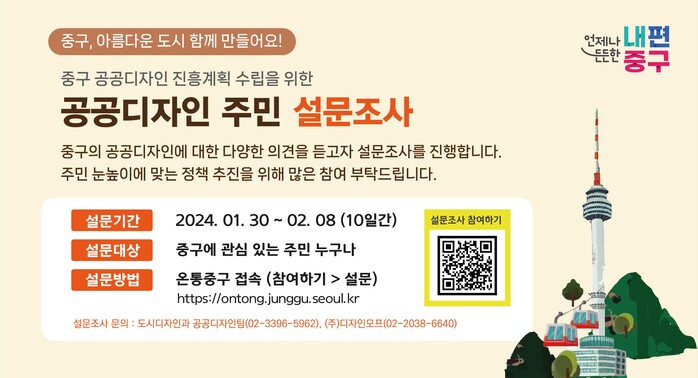 [시민일보 = 여영준 기자] 중구(구청장 김길성)는 30일~2월8일 공공디자인에 관한 주민 설문조사를 한다고 밝혔다.