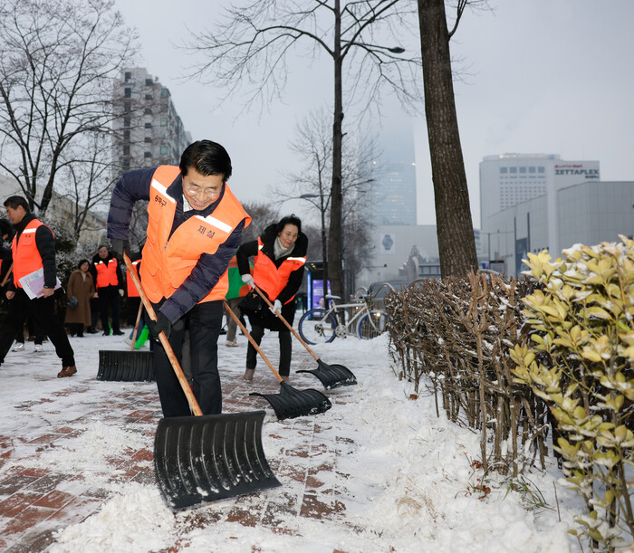 | ▲ 주민들과 제설 작업을 하고 있는 서강석 구청장. (사진=송파구청 제공) |